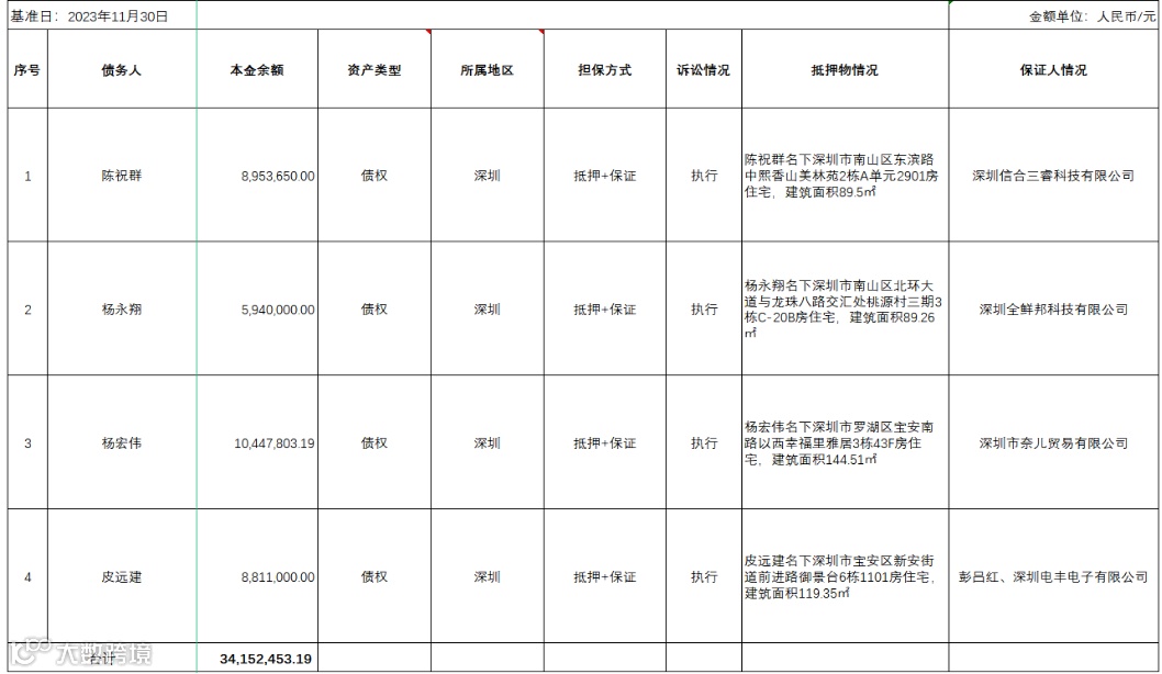 广州广永投资管理有限公司将于2023年12月21日起至2023年12月27日17时止在银通前海金融资产交易中心对其持有的陈祝群等4户不良债权资产包进行公开挂牌转让,转让基准日为2023年11月30日,转让底价为人民币2,995万元。