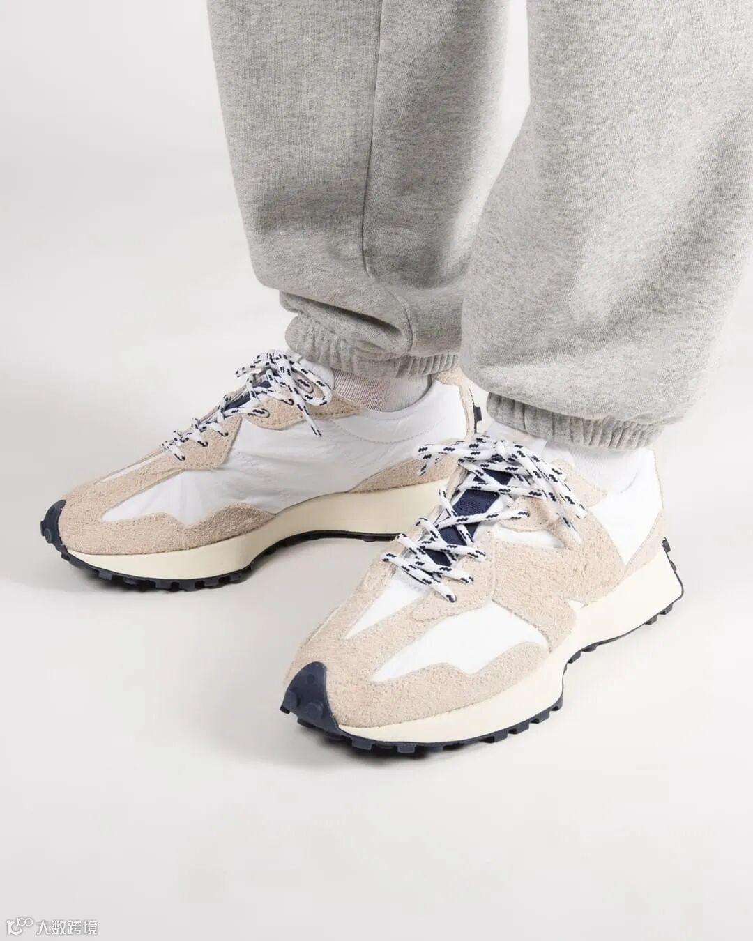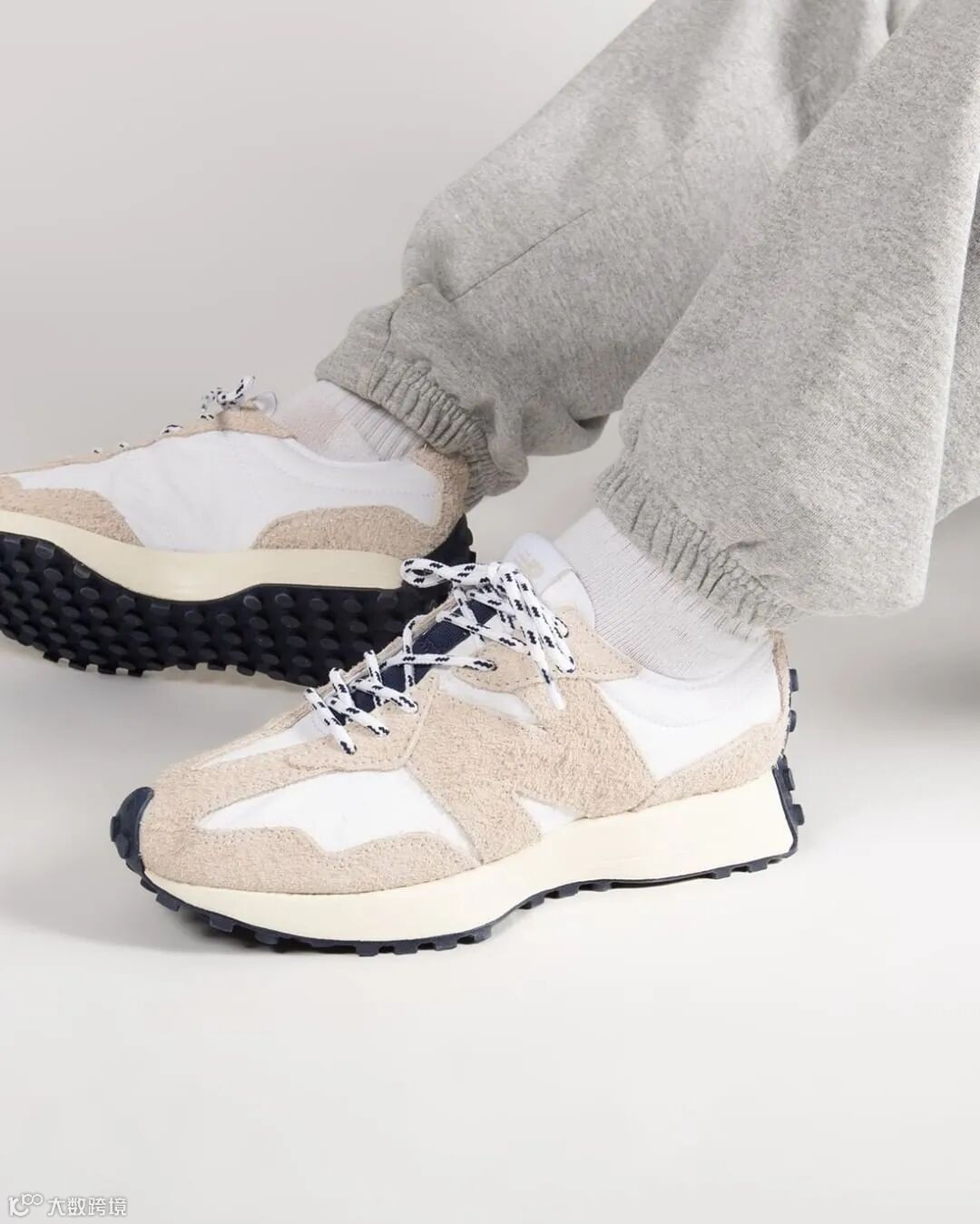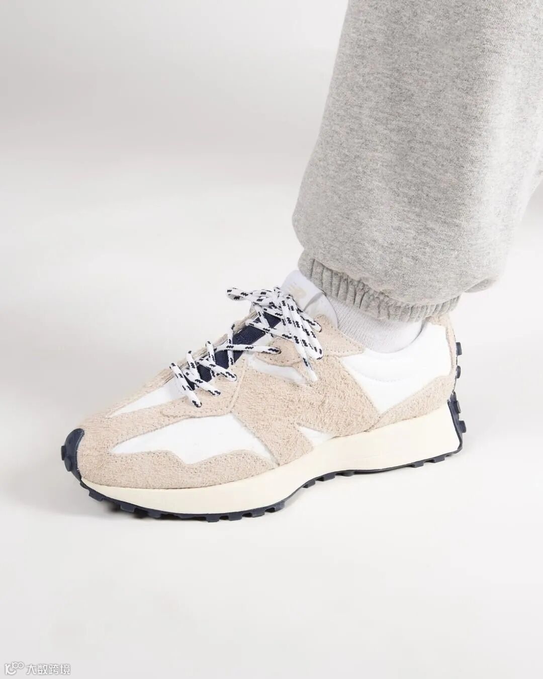 鞋款以米灰色长麂皮