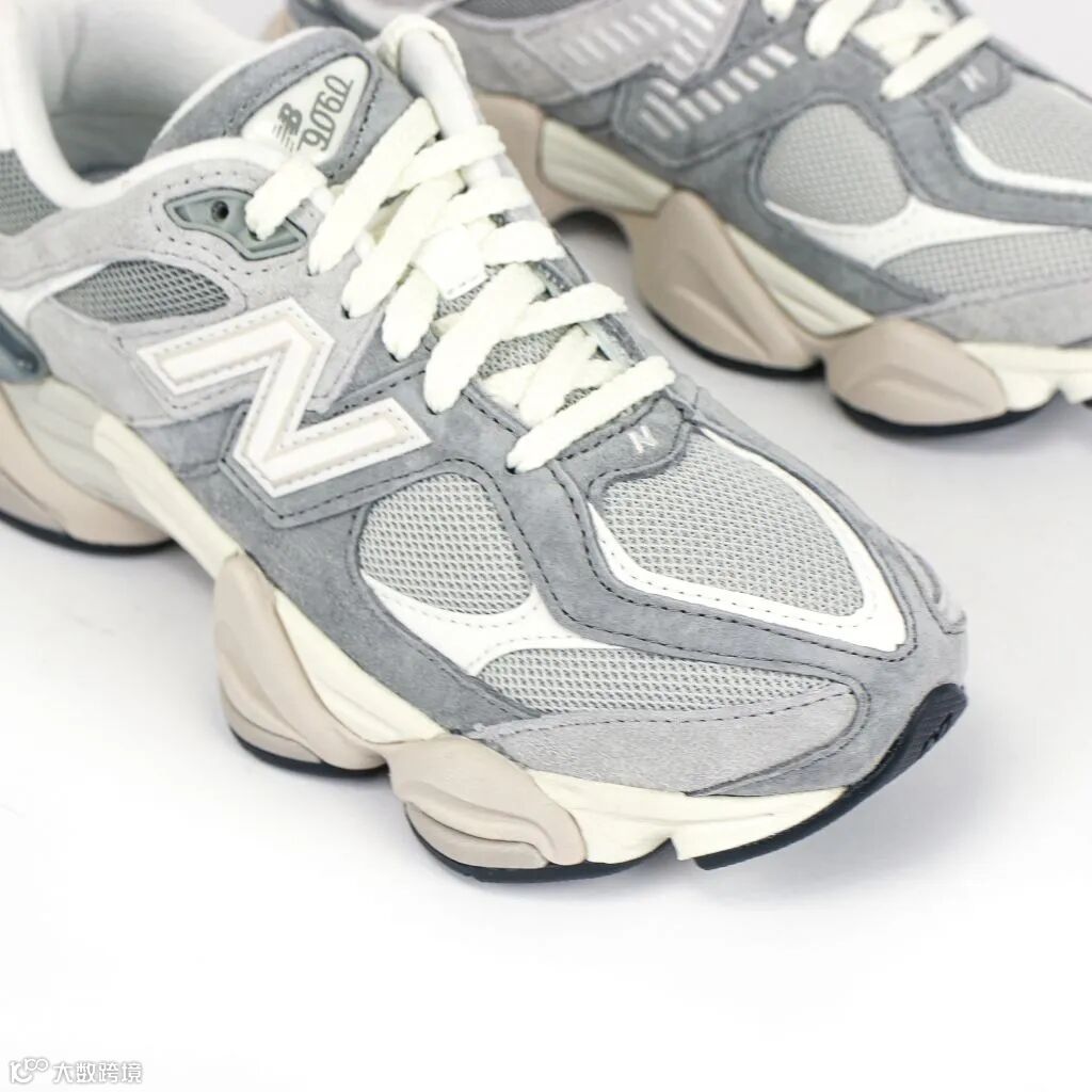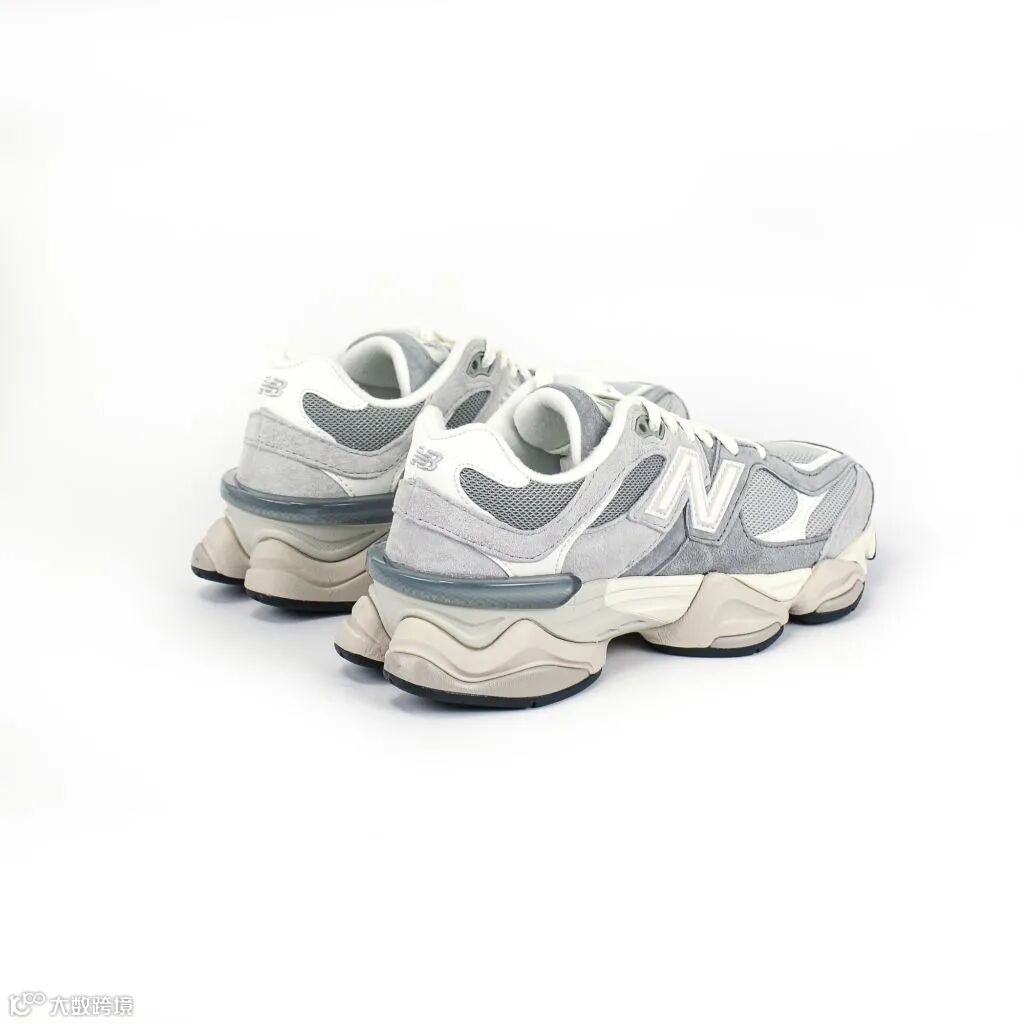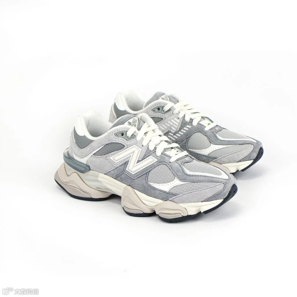 要选一双秋冬百搭款 9060 ,可以看看这双。颜色使用元祖灰和雾霾灰拼接,外添加白色分隔,强调两个灰度之间的对比。搭配纯色系衣物,效果非常棒。