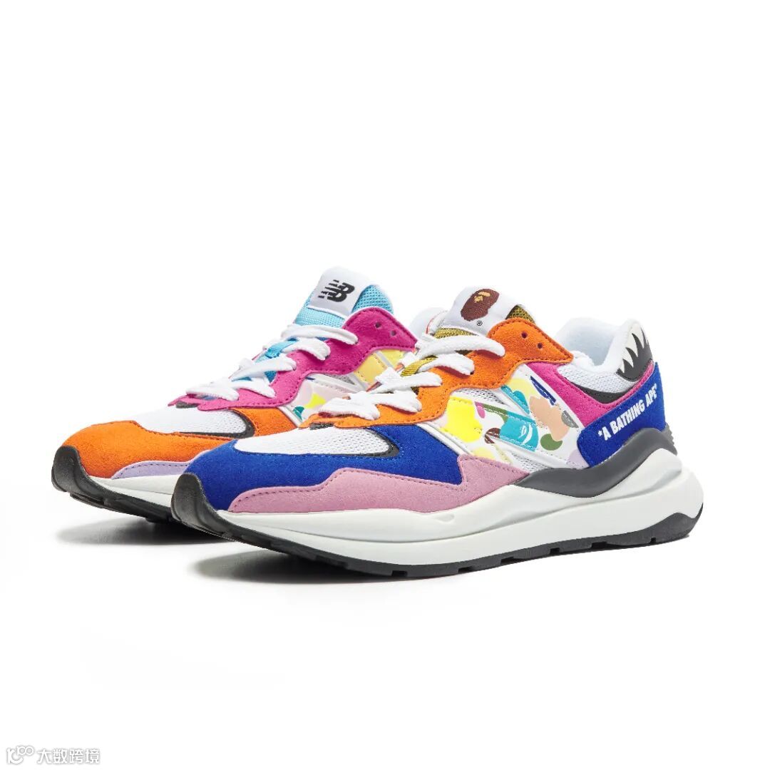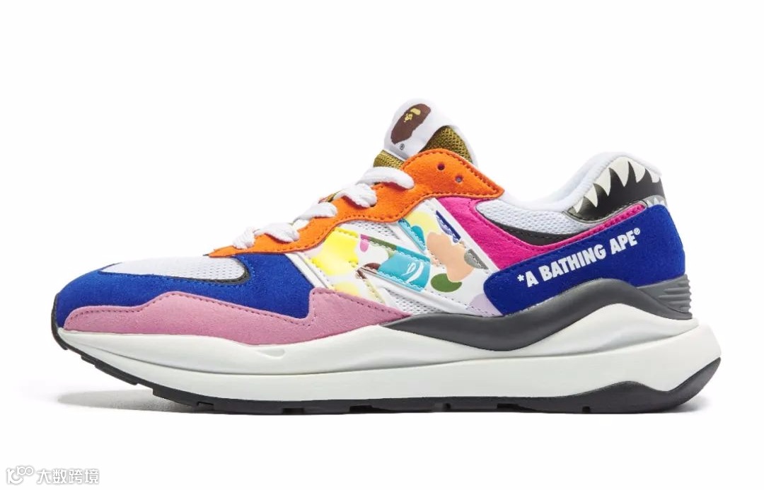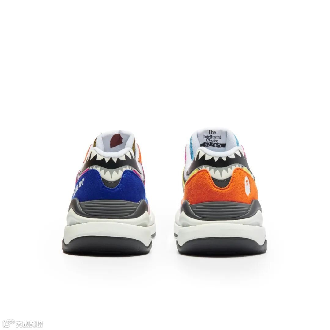 当 Bape ® 元素融入 New Balance 57/40,会碰撞出怎样的花火?本次发售的 57/40 采用橘蓝粉玫红配色进行诠释。两侧 N 字母,融入 Bape ® 经典猿人迷彩图案,鞋舌标志与鞋身后方,分别有布贴猿人图案,以及猿人压印图案。鞋后跟装饰片处印有 Bape ® 独有的鲨鱼利齿图案。