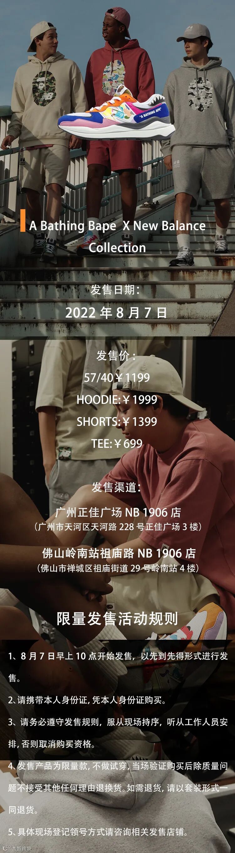 今季,国际知名运动品牌 New Balance ,再度联手好朋友 —— 来自日本街头品牌 ABATHING APE ®(Bape ®)发布全新的联乘套装。 以 New Balance 「57/40」「Clothing」为载体再次打造新一季的「Bape®」帝国。
