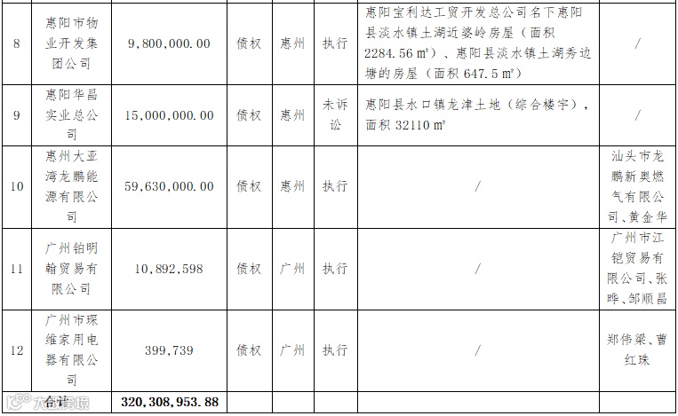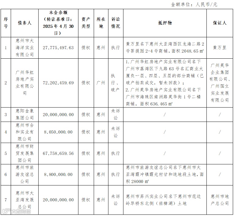 一、拟处置债权:惠州市大海洋实业有限公司等12户不良债权资产包,具体详见下表: