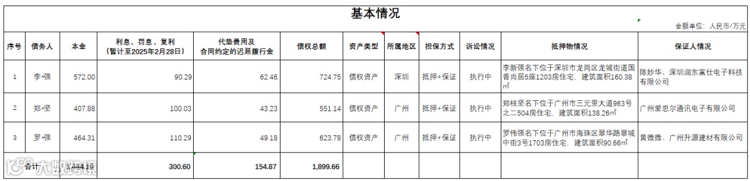 1、债权总额约为人民币1,899.66万元,其中本金约为人民币1,444.19万元,利息、罚息、复利(暂计至2025年2月28日)合计约为人民币300.60万元,代垫费用及合同约定的迟延履行金合计约为154.87万元。