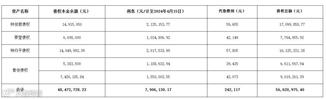 1、林俊君等4户不良债权资产,截至转让基准日2024年4月15日,债权金额情况如下: