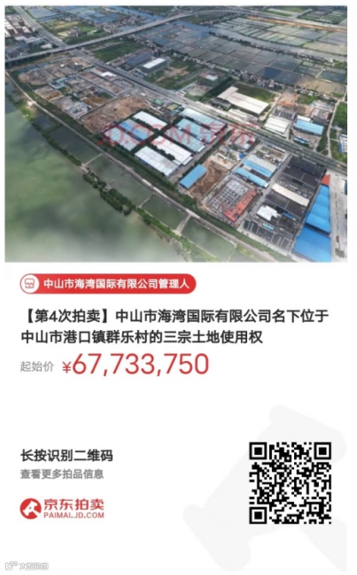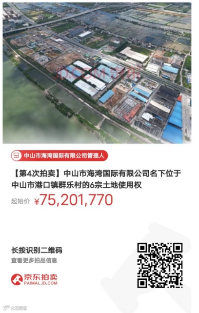 中山市海湾国际有限公司管理人(下称管理人)将于2024年1月27日10时起至2024年1月28日10时止(延时的除外)在京东拍卖破产强清平台上对中山市海湾国际有限公司名下位于中山市港口镇群乐村的合计9宗土地使用权进行公开拍卖活动,现公告如下: