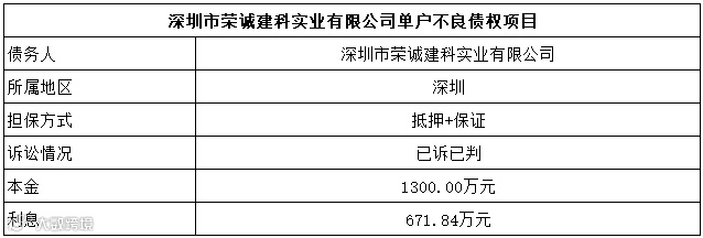 广州广永投资管理有限公司拟公开征集深圳市荣诚建科实业有限公司单户不良债权项目的意向客户,项目具体情况如下: