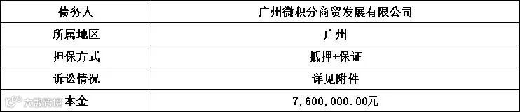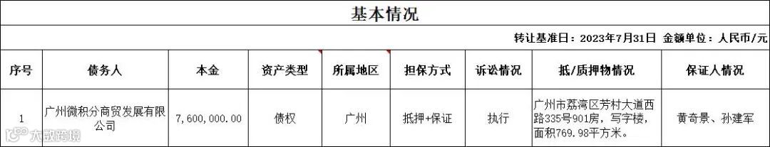 广州广永投资管理有限公司拟公开征集广州微积分商贸发展有限公司单户不良债权项目的意向客户,项目基本信息如下: