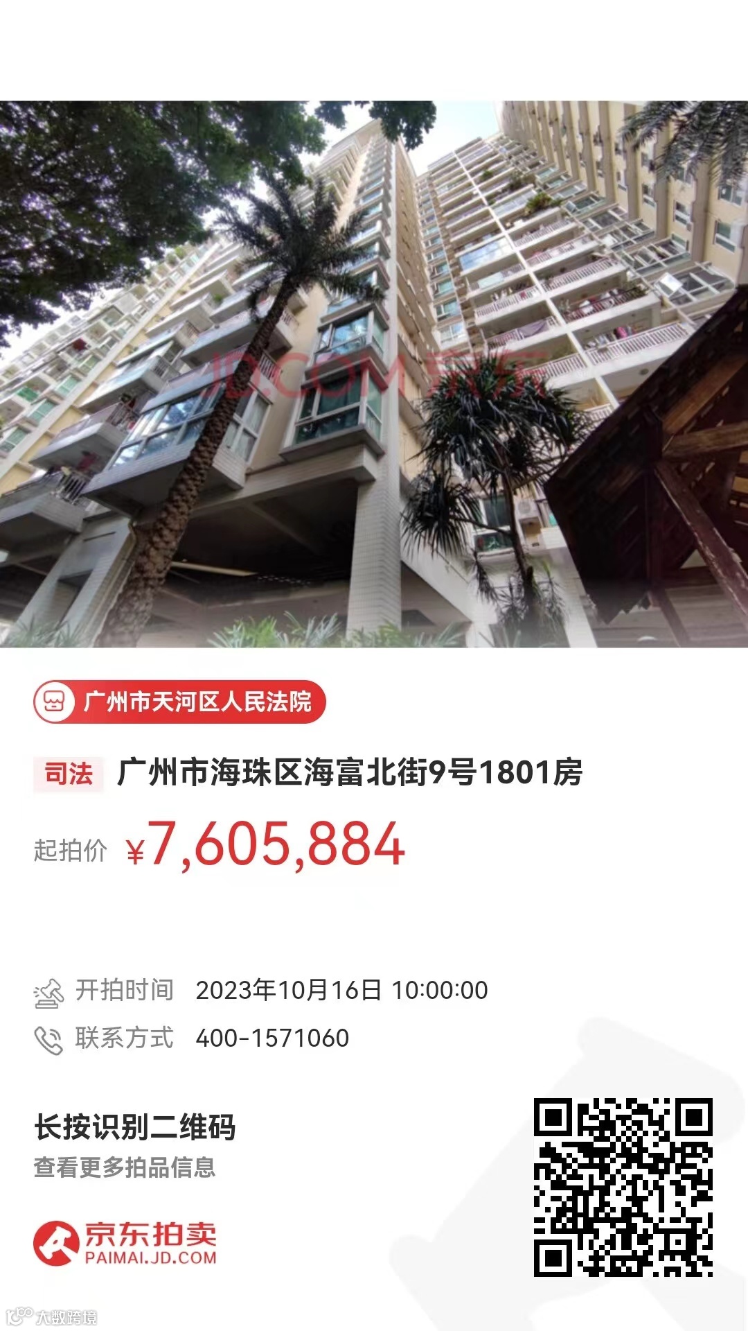 一、拍卖标的:广州市海珠区海富北街9号1801房,建筑面积:233.5938平方米,专有建筑面积:192.1502平方米。