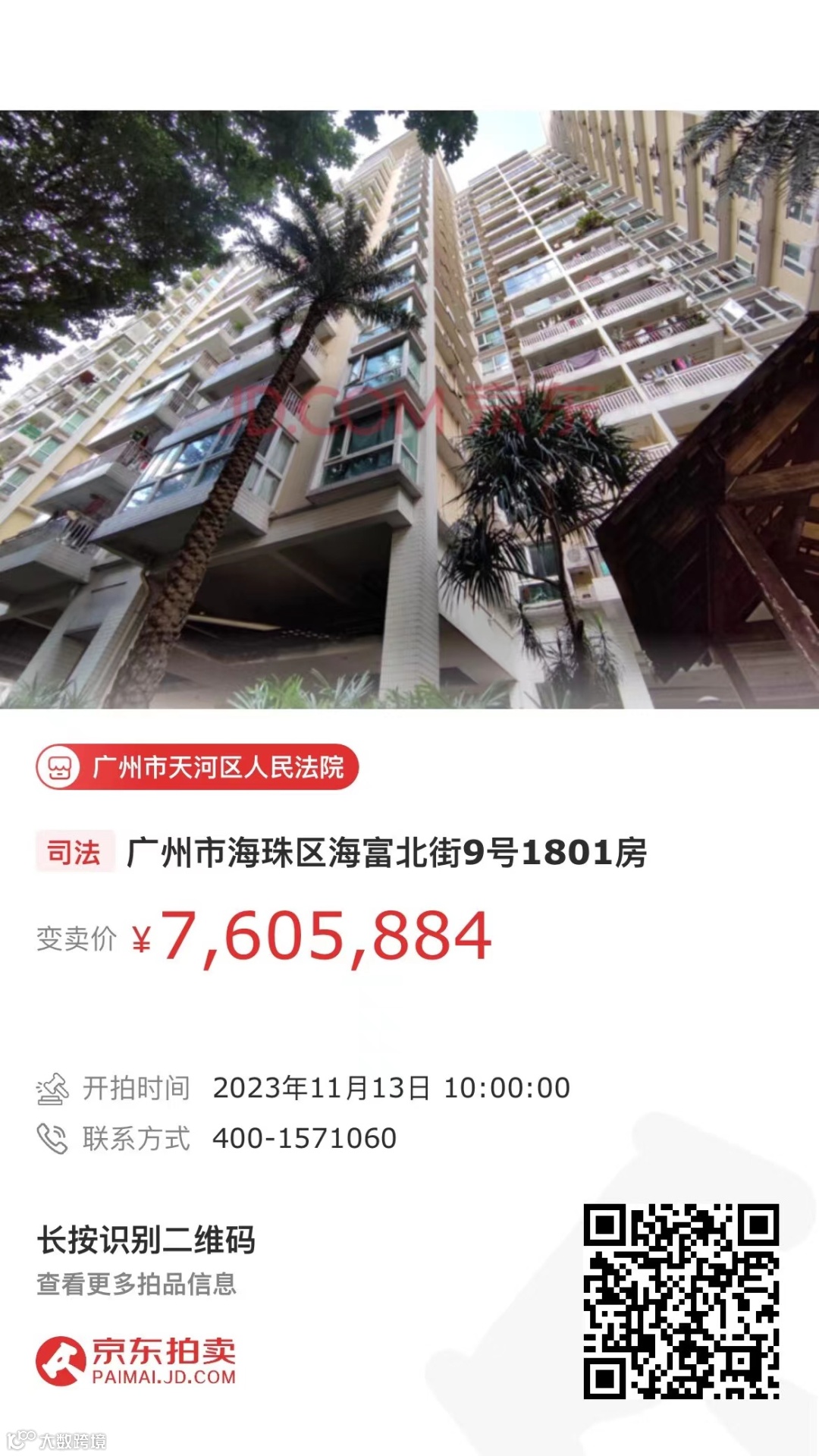 一、拍卖标的:广州市海珠区海富北街9号1801房,建筑面积:233.5938平方米