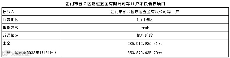 截至2022年1月31日,债权本息总额为人民币63,938.36万元,其中,本金余额为人民币28,551.29万元,利息为人民币35,387.06万元。担保方式为保证担保,保证人主要位于江门地区,诉讼状态包括终本、破产。