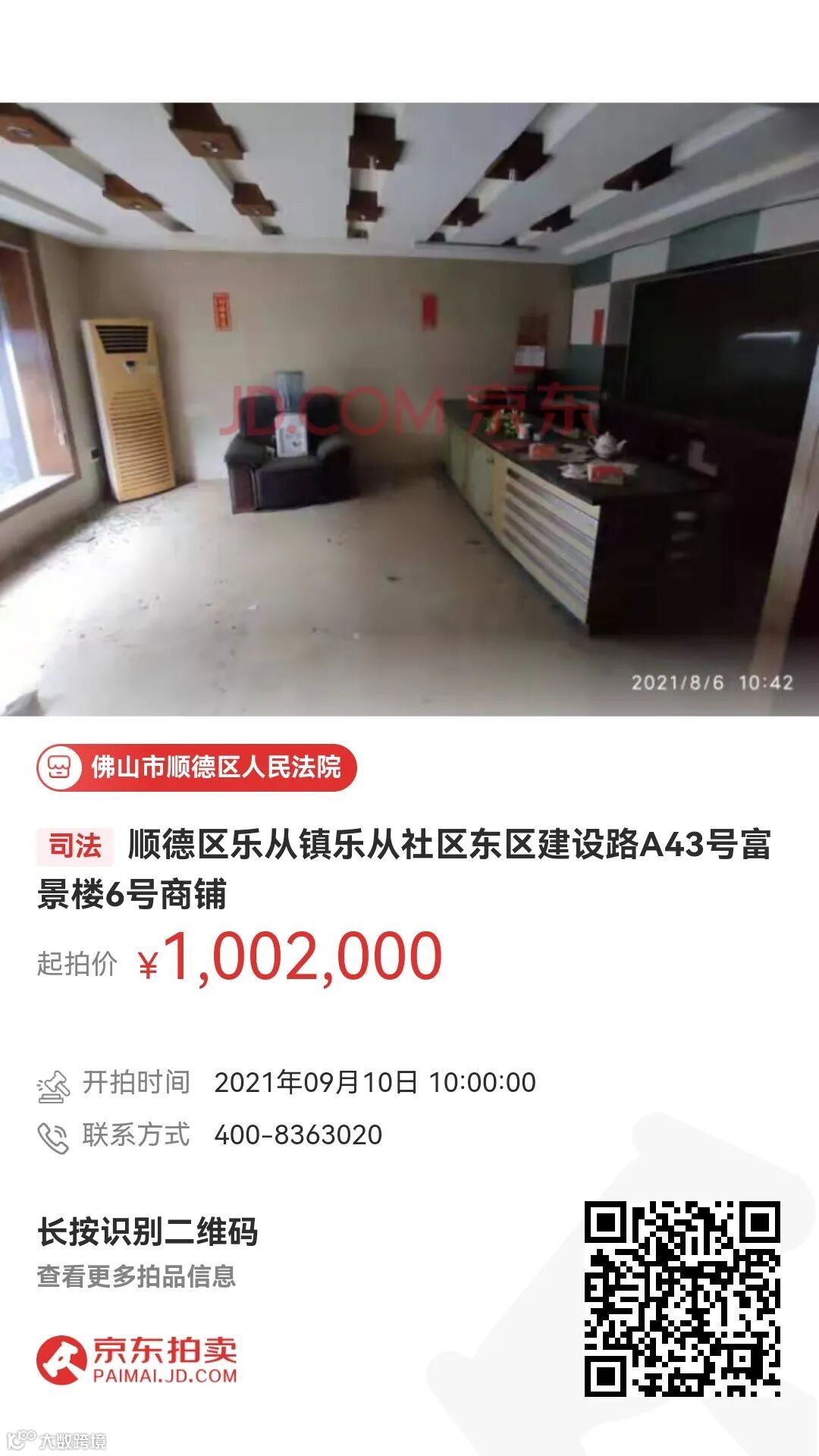 一、拍卖标的:位于佛山市顺德区乐从镇乐从社区东区建设路A43号富景楼6号商铺。