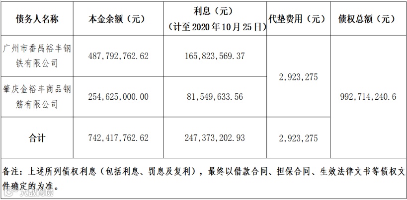 广州市番禺裕丰钢铁有限公司等2户债权资产包债权本金、利息、代垫费用等如下: