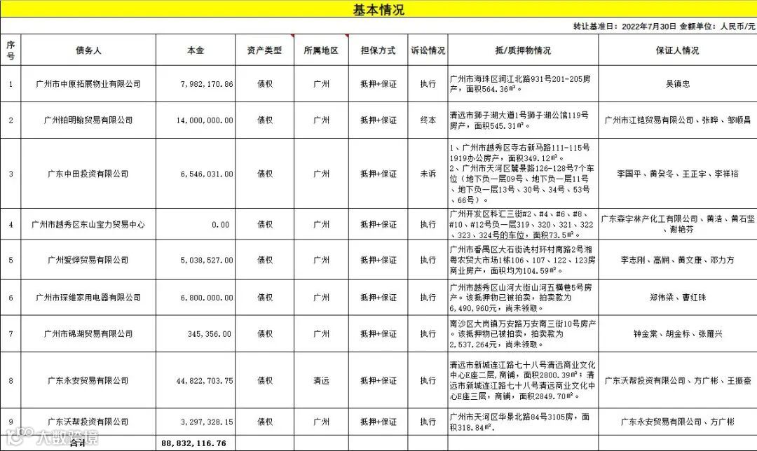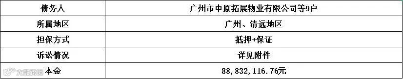 广州广永投资管理有限公司拟公开征集广州市中原拓展物业有限公司等9户不良债权项目的意向客户,项目基本信息如下: