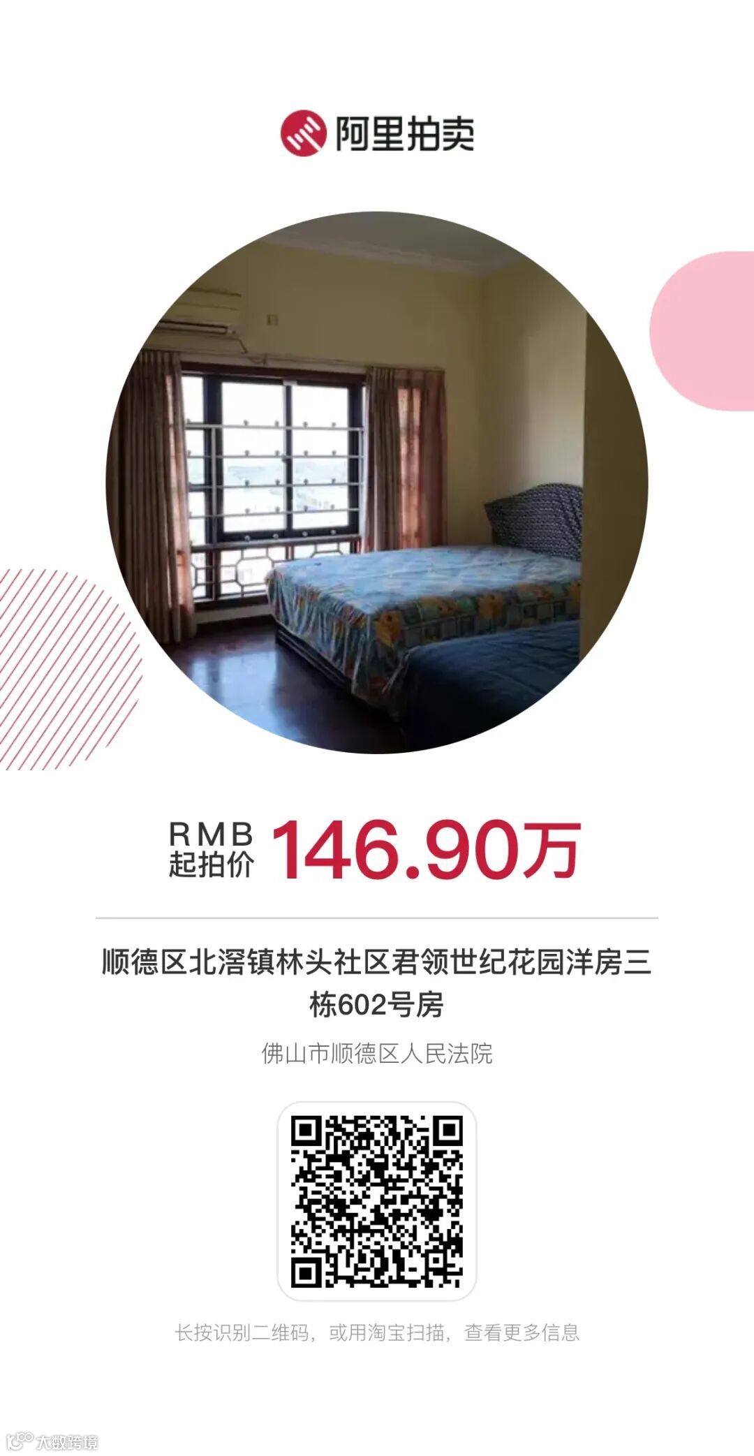一、拍卖标的:位于佛山市顺德区北滘镇林头社区君领世纪花园洋房三栋602号房。