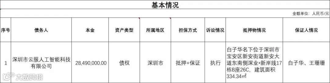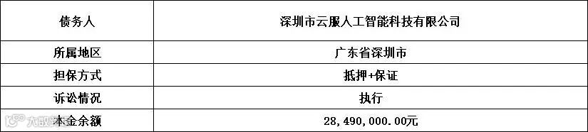 广州广永投资管理有限公司拟公开征集深圳市云服人工智能科技有限公司单户不良债权项目的意向客户,项目基本信息如下: