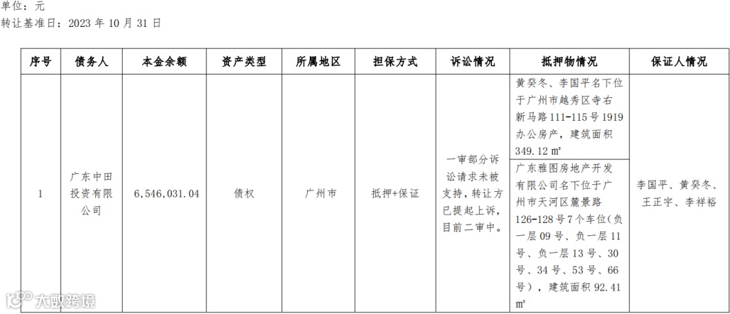 广州广永投资管理有限公司将于2023年12月1日9时起至2023年12月7日16时止在广东金融资产交易中心对其持有的广东中田投资有限公司单户不良债权项目进行公开挂牌转让,转让基准日为2023年10月31日。