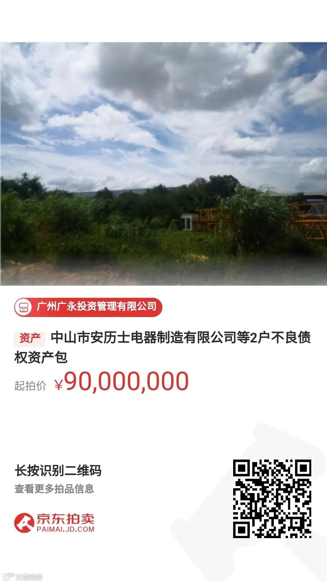 广州广永投资管理有限公司将于2022年6月27日10时至2022年6月27日16时止(延时的除外)在京东网资产竞价网络平台上对持有的中山市安历士电器制造有限公司等2户不良债权资产包进行公开挂牌转让,转让基准日2022年5月15日。
