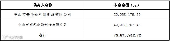 中山市安历士电器制造有限公司等2户债权资产包债权本金余额等如下: