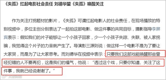 刘德华也曾在影片的宣传路演中呼吁帮助人物原型寻子,他曾表示,只要这部电影能够唤醒那些曾经犯错的人不要再犯,就是我们的福气……透过这个电影,只要你知道、关注了这件事,我就已经说谢谢了!