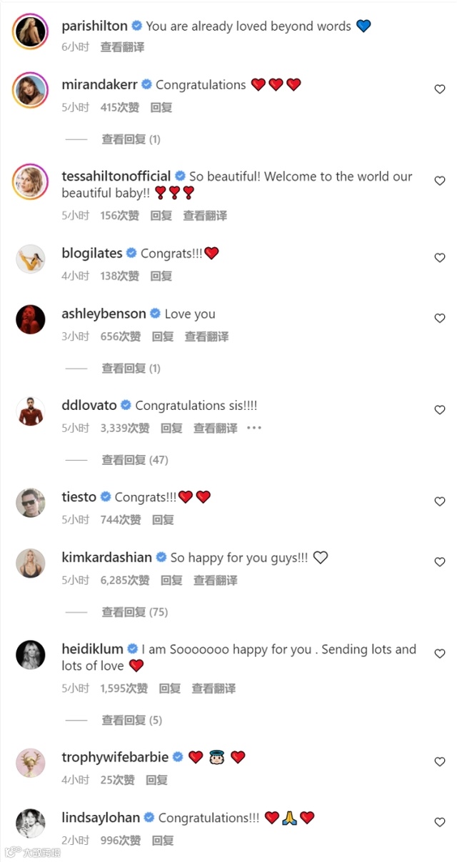 评论区中,包括金·卡戴珊、米兰达·可儿、黛米·洛瓦托、铁叔、海蒂·克鲁姆、林赛·罗韩等一众巨星们纷纷送上祝福,名媛鼻祖的人脉圈确实牛。