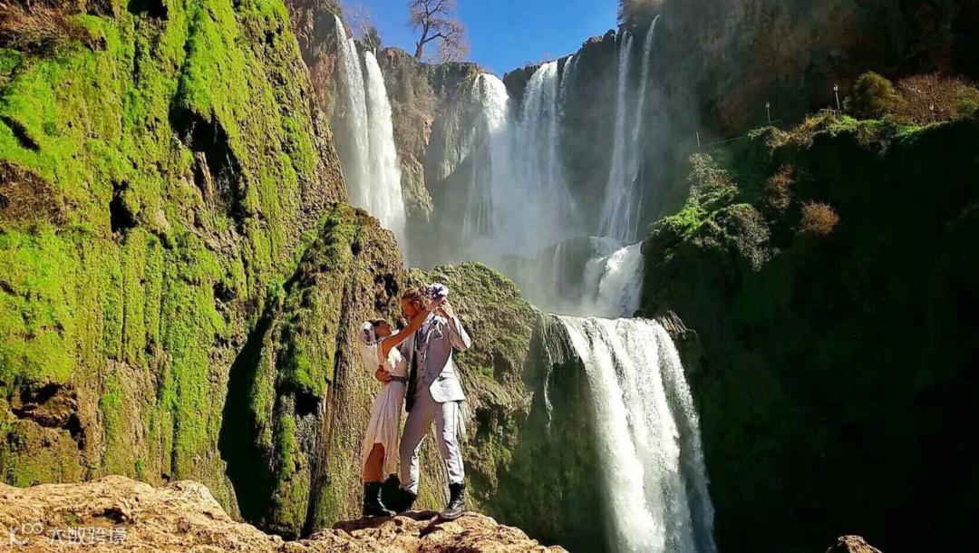 在气势磅礴的高山瀑布前,