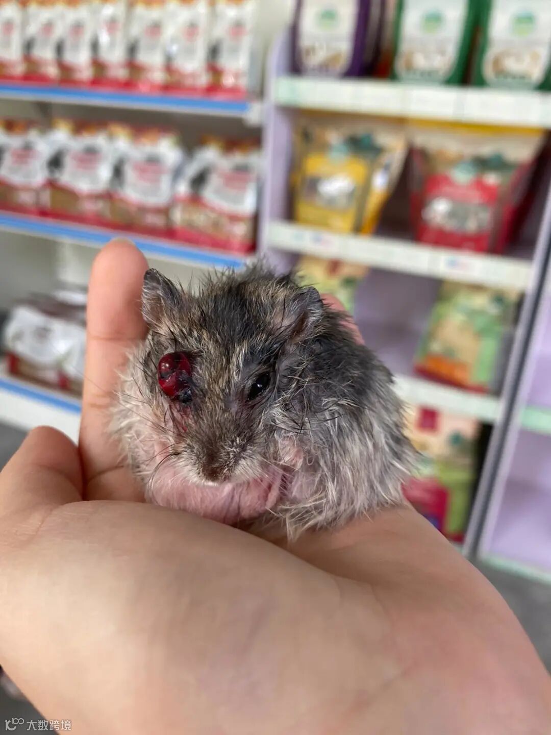 这只仓鼠被发现患有多种疾病,如右眼肿胀和感染,左眼左脚肿胀,左眼有严重白内障。