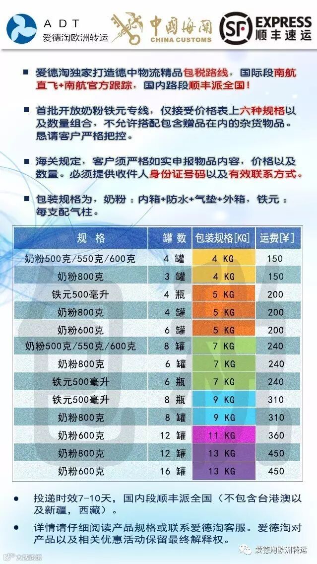 阳光清关的包裹,可以走的奶粉品种有爱他美,鸿乐,特福芬,喜宝,美乐宝的普通奶粉,爱他美白金版,爱他美,喜宝,雀巢HA系列可以走,雀巢1+,2+可以,HOLLE羊奶可以走。其他铁罐装的,还有特殊奶粉暂不能走包税路线。500ML铁元可以走,下单规格严格按照价格表。盒数,罐数必须符合海关要求。