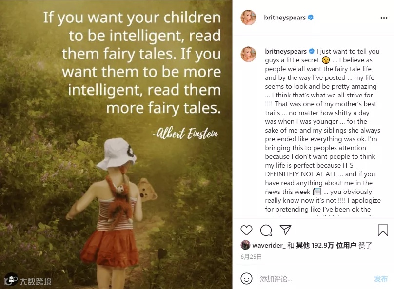 在听证会结束之后,布兰妮在INS上发文,向粉丝们道歉,说自己一直都在“假装快乐”。文字写的十分动情,她说“我不幸福,我夜不能寐,我意志消沉,终日以泪洗面”。