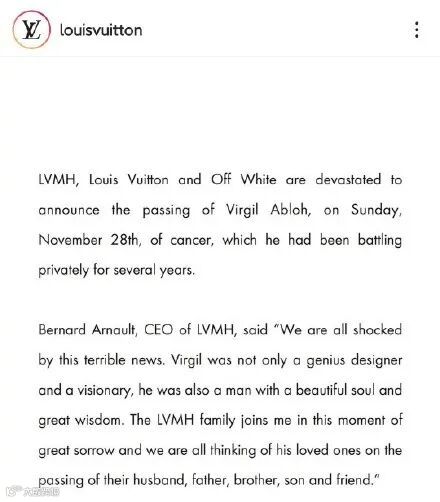 随后,路易威登所属的LVMH集团发布了对于Virgil Abloh的悼念,LVMH集团董事长和首席执行官Bernard Arnault表示:“我们都震惊于这个糟糕的消息,Virgil不仅是一位天才设计师,一位富有远见卓识的人物,同时也是一位拥有美丽灵魂、极具智慧的人物。在这个悲情的时刻,LVMH大家庭的所有人都沉浸在巨大的悲痛中,并对 Virgil 所爱的家人和朋友对他的离世致以最真诚的悼念。”