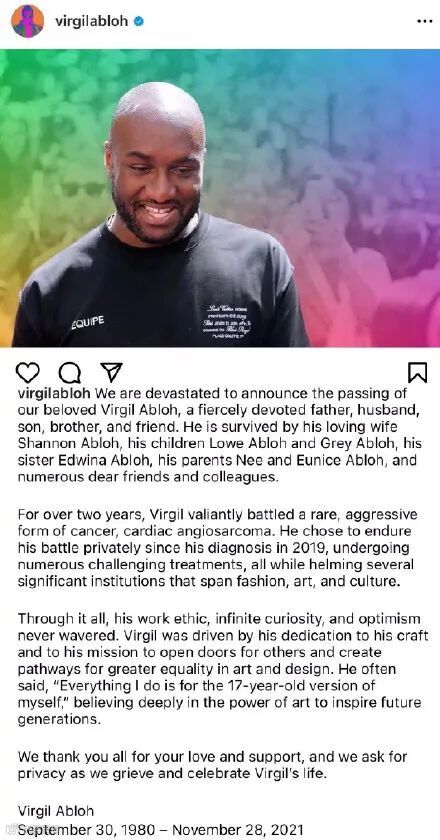 一切似乎都来的毫无预兆,甚至在他去世前几天还在ins上为自己的品牌Off-White将在黑色星期五发布的新系列宣传,为什么突然就这样了?