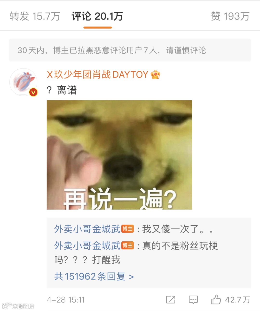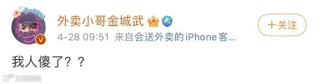 昨天,微博一名叫@外卖小哥金城武的大V发表了一张截图,并表示“我人傻了??”