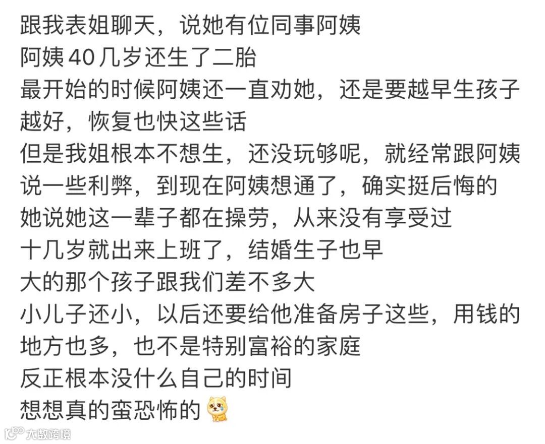也有人后悔自己太早生孩子一辈子操劳,从来没有享受过。