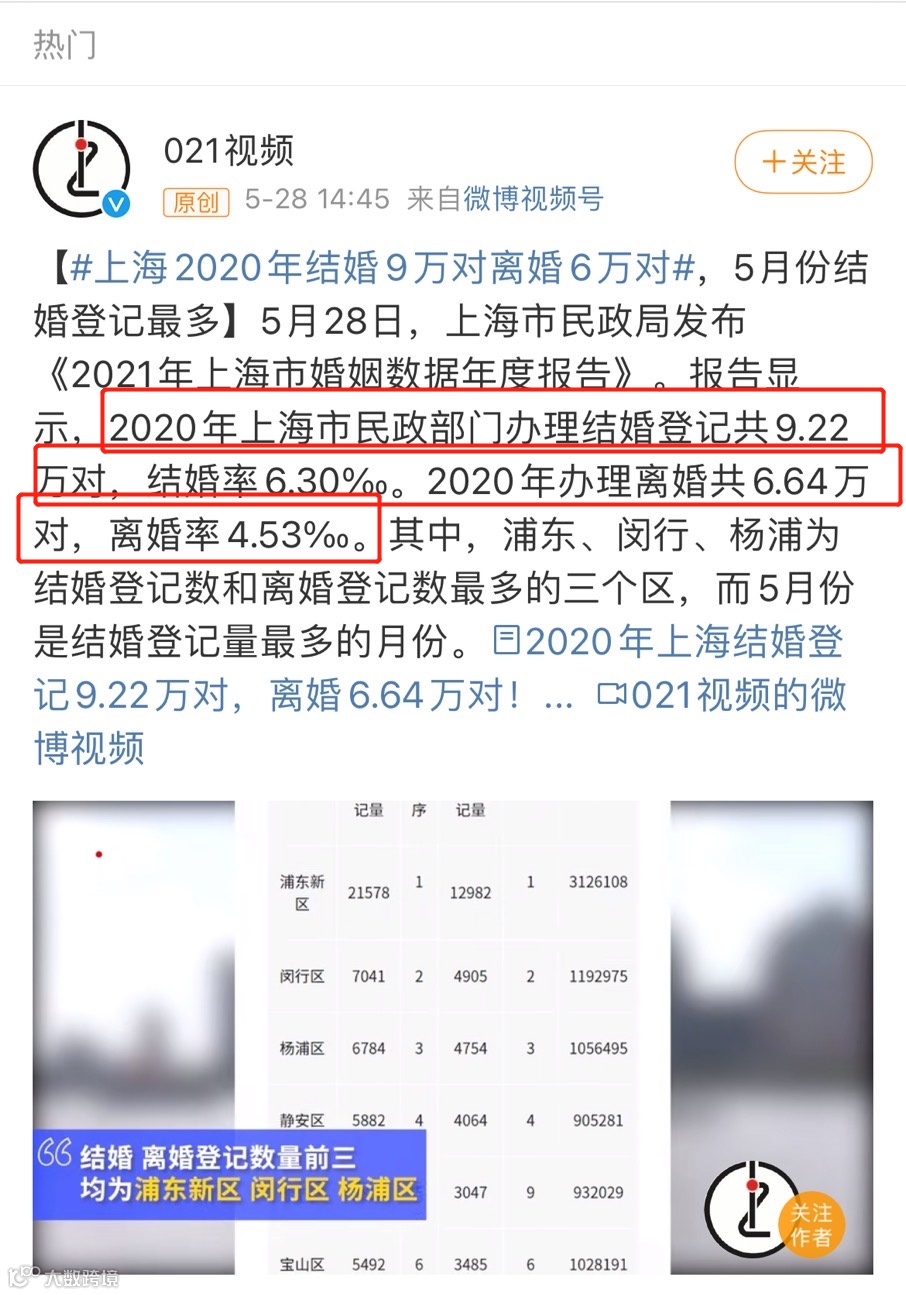 《2021年上海市婚姻数据年度报告》显示,2020年上海市民政部门办理结婚登记共9.22万对,结婚率6.30‰。2020年办理离婚共6.64万对,离婚率4.53‰。