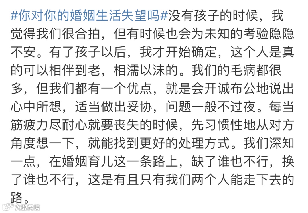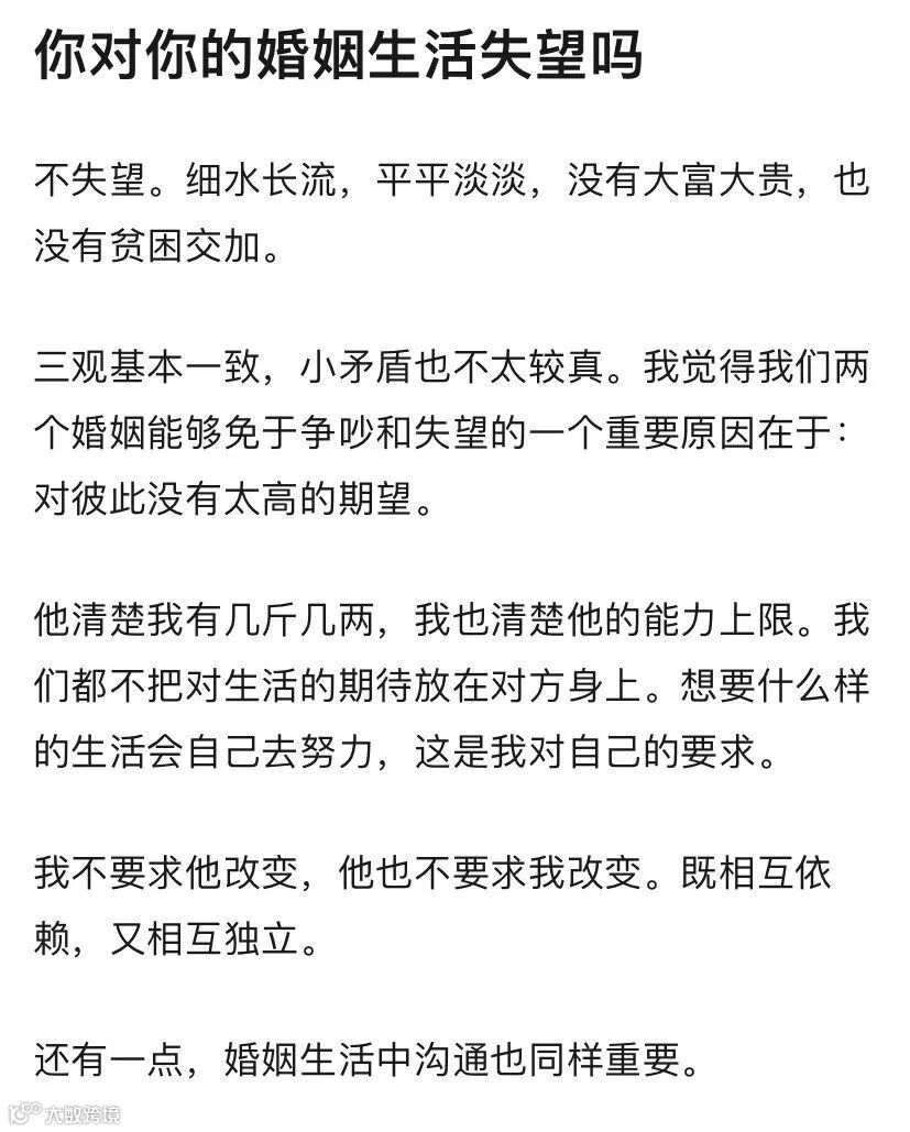 在微博#你对你的婚姻生活失望吗#这个话题中,也有不失望的,他们做到了“既相互依赖,又相互独立。”
