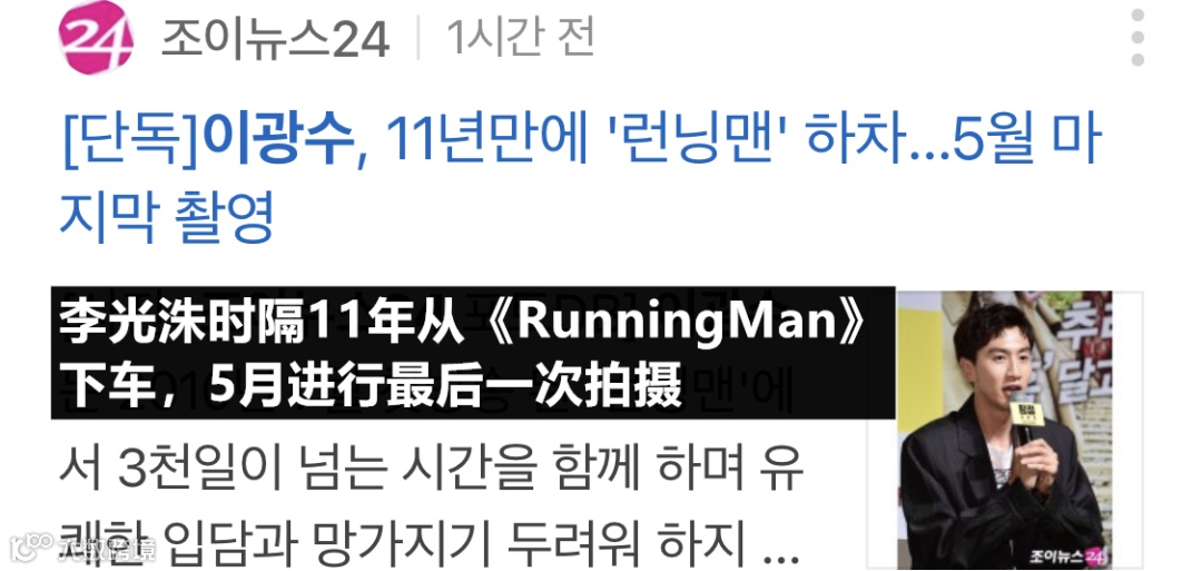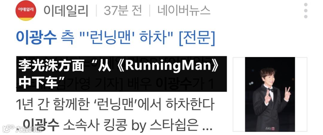 大家好,这里是King Kong by Starship。演员李光洙在结束5月24日最后一次录制后,将从SBS《RunningMan》中下车。