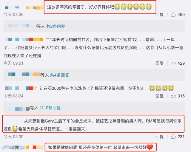 为此,不少网友表示理解,11年长时间的同甘同苦,作出下车决定很不容易。自然也有不少网友很是不舍,留言道:“从未想到继Gary之后下车的会是光洙,被综艺之神眷顾的男人啊。RM可是我每周快乐源泉,希望光洙身体早日康复,一定要回来!”,“没有了他快乐少一半”,“没有他感觉没啥意思了”……