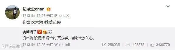 阚清子分手的时候说:“没出轨、没捉奸、没合约,真分手,谢谢大家关心!”连续三个“没”看似强调一切平静,却暗含反转,真正有的就是没的。