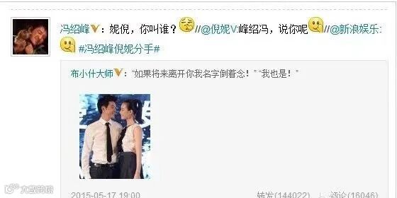 倪妮与冯绍峰两个人交往的时候,曾被网友调侃,如果两个人分手,名字就要叫倒过来念。可恰好的是,两个人的名字即使倒过来,仍然是原名的发音,所以也成为了明星分手文案的一个经典。