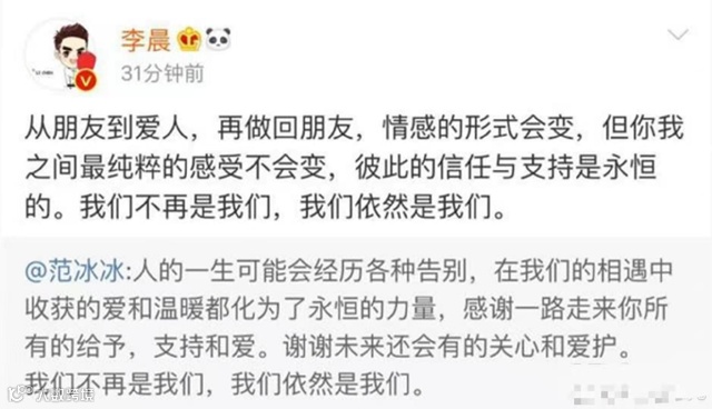 范冰冰和李晨当初在一起的时候,以“我们”为官宣恋情的文案,也一度受到网友的追捧。那个时候,大家都以为范冰冰找到了真爱,毕竟李晨的人品一直在圈里广受好评。后来两个人也经常传出定婚即将结婚的消息,直到范冰冰事业受到重挫以后,两个人的恩爱也慢慢变得少了起来。当两个人再次回应的时候,范冰冰发文为“我们不再是我们,我们依然是我们”。