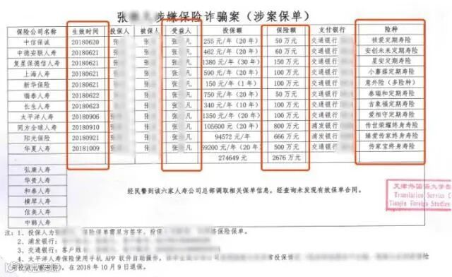 由天津警方补充提交的保单明细,据统计,事发前张凡密集投保11份,总保额2676万。