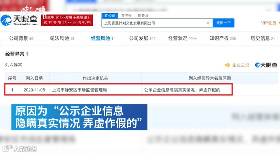 王思聪旗下上海香蕉计划文化发展有限公司被上海市静安区市场监督管理局列入经营异常名录,原因为“公示企业信息隐瞒真实情况、弄虚作假的”。