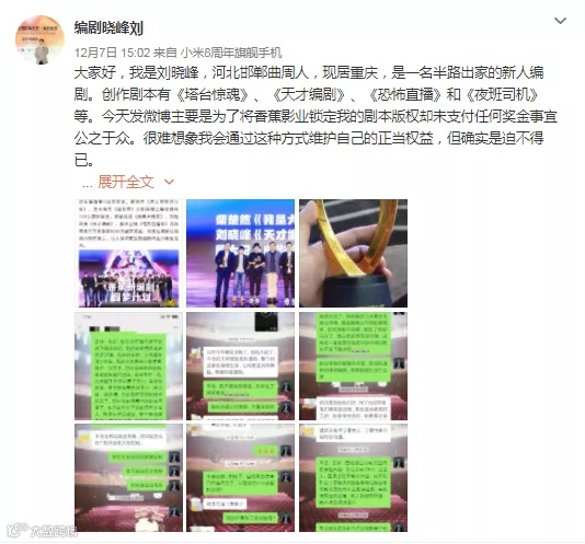 而公开讨薪的刘晓峰,就是《天才编剧》编剧,三等奖获得者。