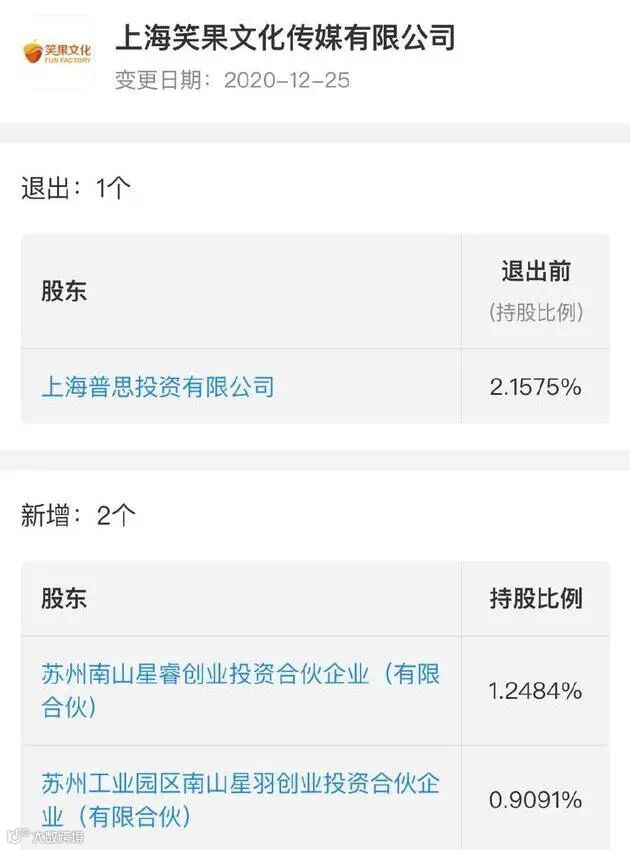 去年年底,由王思聪担任法定代表人的上海普思投资有限公司又退出上海笑果文化传媒有限公司股东行列,新增苏州南山星睿创业投资合伙企业(有限合伙)、苏州工业园区南山星羽创业投资合伙企业(有限合伙)。