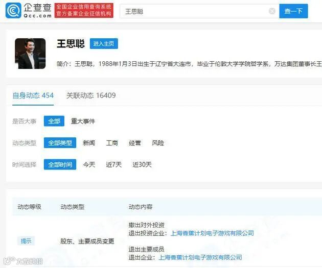 此外,据企查查今日曝光,上海香蕉计划电子游戏有限公司发生工商变更,王思聪退出公司股东及监事,退出前持股9.5%,新增股东英雄体育管理有限公司,持股63.5%。同时,公司经营范围新增体育赛事策划、体育竞赛组织、体育中介代理服务、体育经纪人服务、票务代理服务等。
