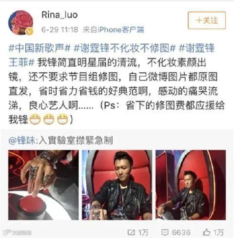 不管是演任何戏,上任何的综艺,开任何的演唱会,谢霆锋都不会化妆。
