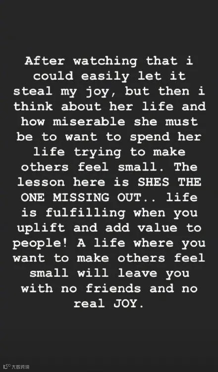 “我在一百万年内绝不会希望有人受到这样的对待,我也绝不会纵容这种仇恨的行为。我只想支持、提升和鼓励这个行业中的其他女性,并希望她们只有爱和成功,我希望我所有的追随者和支持者也能这样做!祝愿那个视频中的年轻女子一切顺利,希望她能在今生找到爱、和平和幸福!”