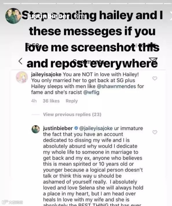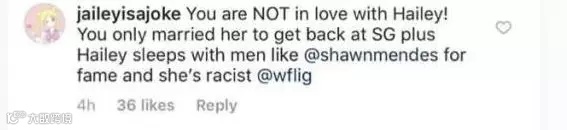 有些CP粉们还是因执念太深,不断地给比伯留言称,你并不喜欢海莉,只是为了报复赛琳娜才结婚的。
