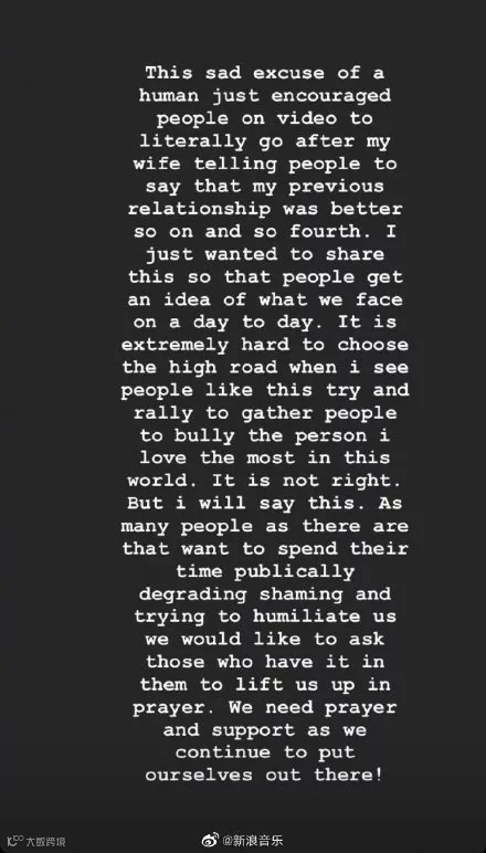 “这个可悲的人,鼓励人们在视频上去追问我的妻子,我只是想把这个分享出来,让大家了解我们每天要面对的事情。但我要说的是,由于有很多人想花时间如此公开地贬低,羞辱我们,所以我们想请大家祝福和支持我们。”