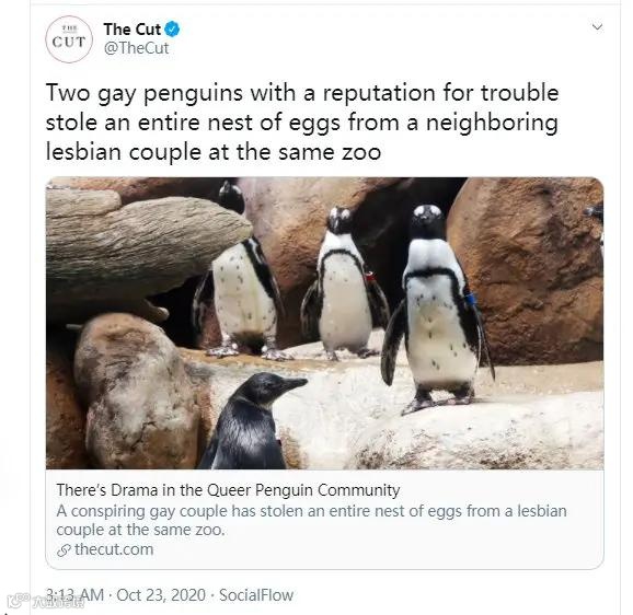 10月27日,据《每日邮报》报道,荷兰阿默斯福特Dierenpark动物园,两只同性恋公企鹅偷了一对异性企鹅夫妇的蛋。它们轮流看守并试图自己孵出来,变相领养一个宝宝,成就“一家三口”的和美生活。