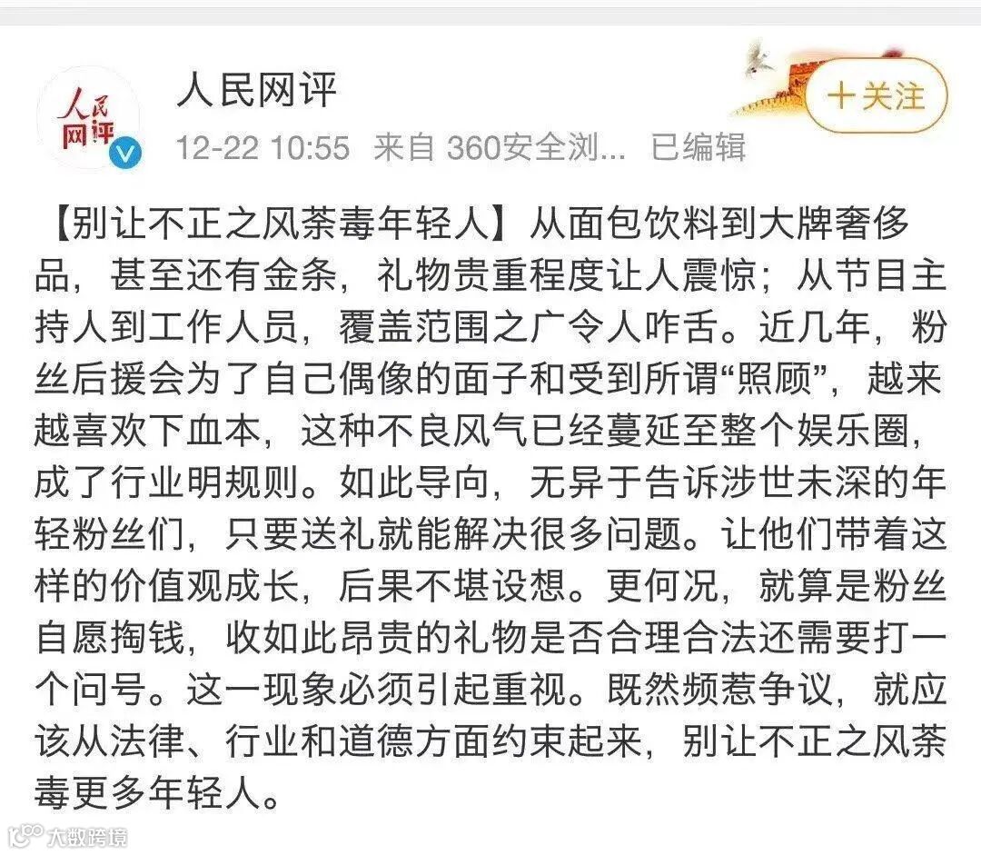 如今出了这档子事,未免不是一件好事,起码能够让流量明星以及幕后工作人员正视问题,拒绝礼物,正确引导未成年人追星。